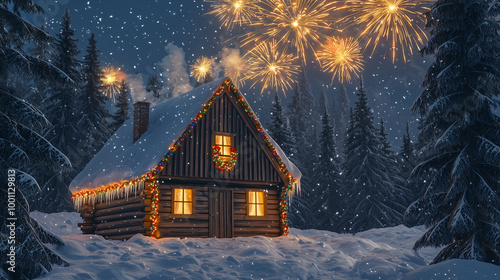 Cozy snow-covered cabin in a winter forest, decorated with Christmas lights. Fireworks light up the sky, creating a festive holiday scene, perfect for Christmas and New Year themes.
