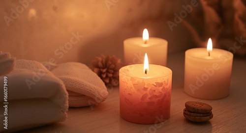 Cozy Spa Ambiance with Candles, Towels, and Wooden Accents for Relaxation.