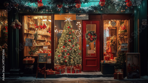 Cozy Store Interior with a Stunning Christmas Tree and Holiday Display