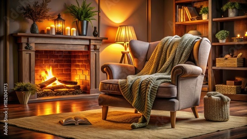 Cozy Sweater Draped Over an Elegant Armchair in a Warm Living Room Setting, Perfect for Autumn and Winter Decor, Inviting Atmosphere, Textured Fabrics, Interior Design Inspiration