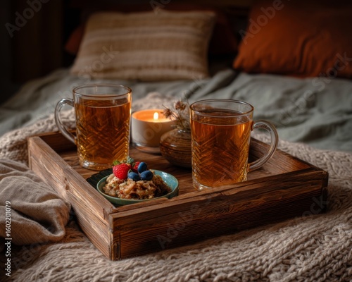 Cozy tea time setup with treats on a wooden tray bedroom still life comfort close-up relaxation