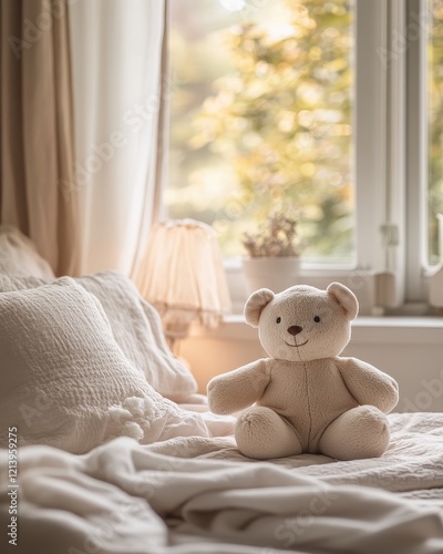 Cozy Teddy Bear on Bed with Soft Light and Blurred Window View in a Calm Bedroom Scene