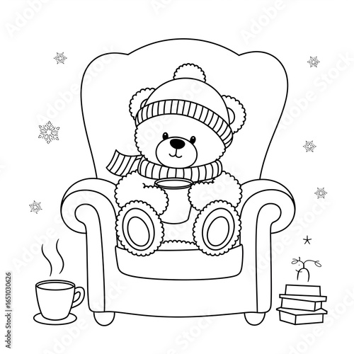 Cozy teddy bear wearing hat and scarf sitting in armchair with hot drink.