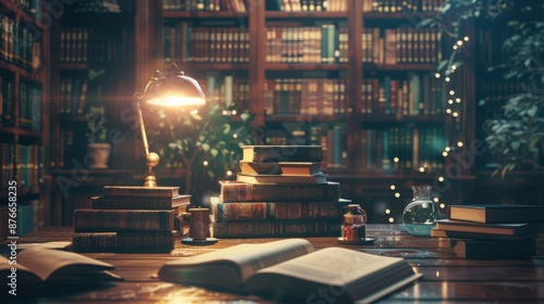 Cozy vintage library with stacks of books, warm lighting, and a serene atmosphere perfect for reading and studying.