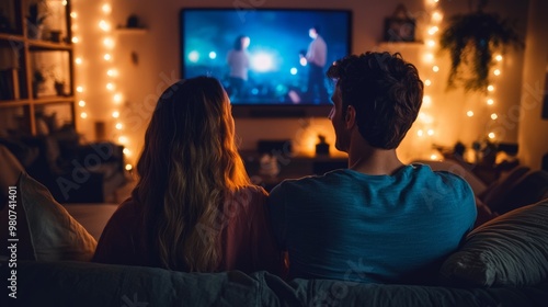 Cozy Virtual Movie Night - Couple Enjoying a Romantic Evening Watching Films Together on Screens in Warmly Glowing Setting