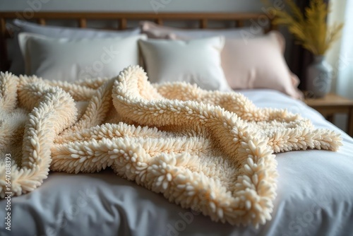 Cozy weighted blanket draped over a bed, soft textures and plush comfort, inviting and relaxing sleep , night, blanket