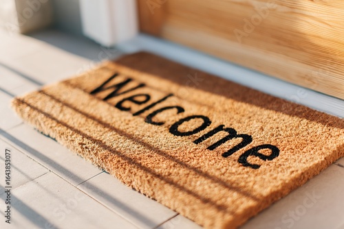 Cozy welcome mat placed at the entrance of a home in warm afternoon sunlight
