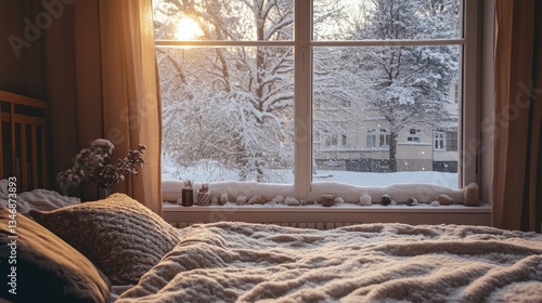 Cozy winter bedroom with snowy view through large window, warm sunlight illuminating soft bedding and decor