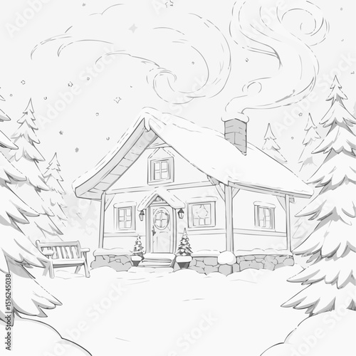 Cozy winter cabin scene sketch with snow and trees for coloring