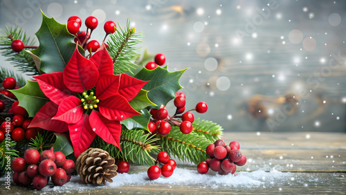 Cozy winter Christmas featuring a branch of red holly berries and poinsettia flowers , cozy, winter, Christmas,branch