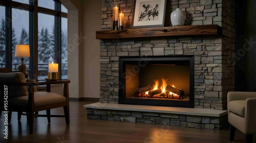 Cozy Winter Evening by the Fireplace with Warm Candlelight. Generated AI