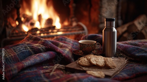 Cozy winter evening escape with warm coffee, sweet cookies, and a crackling fireplace, wrapped in a soft plaid blanket for ultimate relaxation.