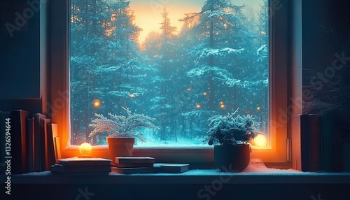 Cozy Winter Interior Scene with Frosty Window and Warm Lighting in a Relaxed Study Atmosphere
