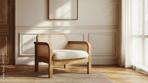 Cozy winter room with a large window revealing a snowy landscape, soft natural light filling the space, style book illustration