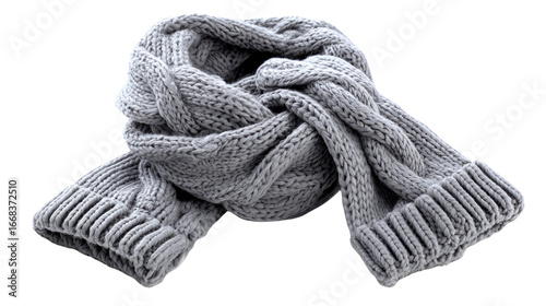 Cozy Winter Scarf: A close-up of a soft gray knitted scarf, intricately textured and designed to keep you warm and stylish during the cold season.