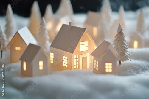 Cozy winter scene with illuminated paper houses in snowy landscape, perfect for holiday decorations and seasonal themes