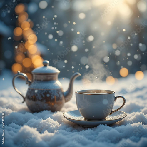 Cozy Winter Scene with Steaming Teapot and Cup on Snowy Surface with Falling Snowflakes and Warm Lights