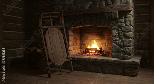 Cozy Winter Scene With Wooden Sled Beside Stone Fireplace Interior