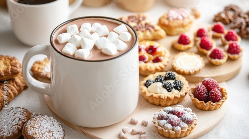 Cozy Winter Treats: A Warm Cup of Hot Chocolate Topped with Marshmallows Surrounded by Delicious Assorted Baked Goods and Tartlets on a Rustic Wooden Board