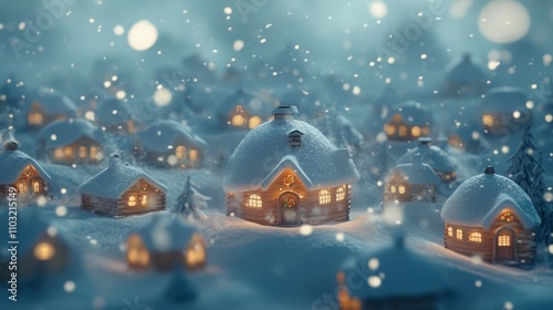 Cozy winter village scene with snow falling softly on charming houses. Festive lights glow warmly against the snowy landscape.