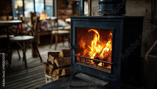 Cozy wood stove in a rustic cafe. Burning fire, warm interior, wooden accents, and chairs