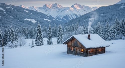 Cozy wooden cabin nestled in deep snow against majestic mountain range at sunrise
