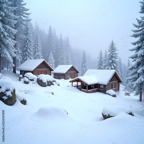 Cozy wooden cabins in snowy pine forest winter wonderland
