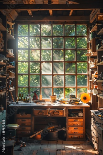 Cozy workshop filled with tools and supplies, sunlight through window
