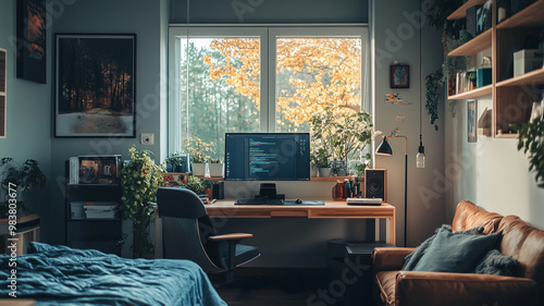 Cozy workspace featuring a computer desk, plants, and autumn views in soft afternoon light