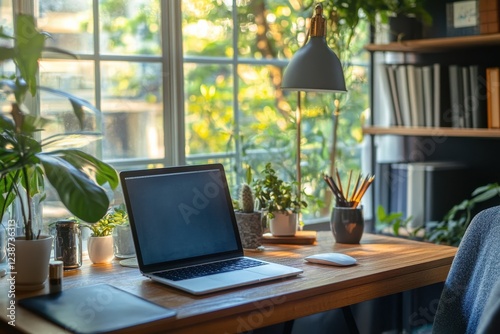 Cozy workspace with plants, laptop, and natural light during a sunny afternoon