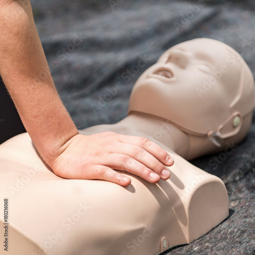 Cpr training outdoors. Reanimation procedure on CPR doll