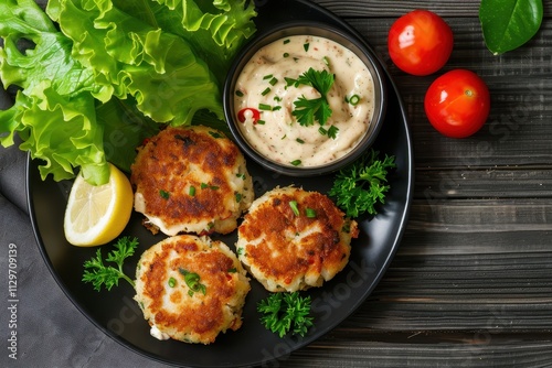 Crab cakes with remoulade lemon tomatoes lettuce on black plate dark wood table top view close up