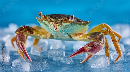 Crab is standing on a blue surface with ice