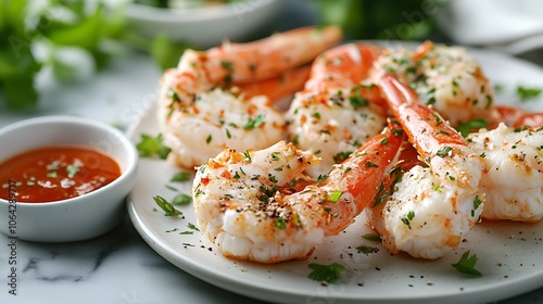 Crab legs with detailed crackled shells, served with dipping sauce on a minimalist plate, warm lighting emphasizing textures and colors, close-up for a vibrant and appetizing view. --ar 16:9