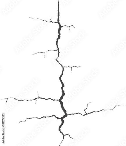 Crack on wall, earth or stone. Scratches lines on surfaces. Lightning and thunderstorm illustration. Fissures on the ground and ice. Graphic explosions textures with holes.