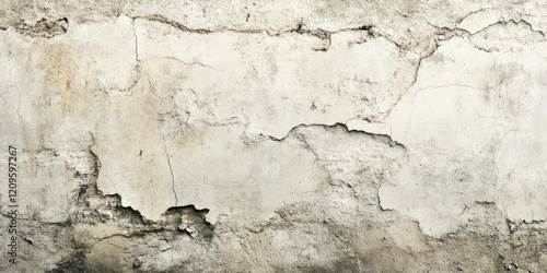 Cracked and weathered white wall texture with peeling paint subtle brown hues and uneven surface creating an aged rustic appearance
