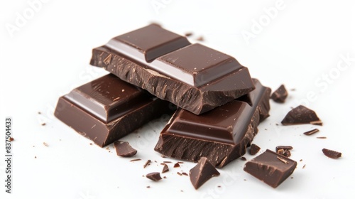 cracked chocolate bar isolated on white background. sweet dessert food menu concept