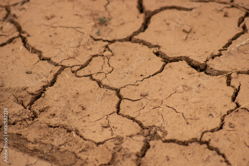 Cracked dry earth surface due to drought, close-up texture of parched soil. Concept of climate change, environmental stress, and land degradation.
