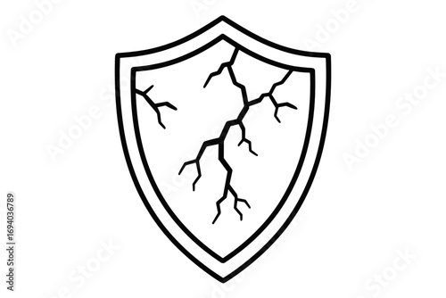 Cracked shield icon representing broken protection and vulnerability. Metaphor for failed security, risk, data breach, and danger. Simple vector line art illustration for concepts.