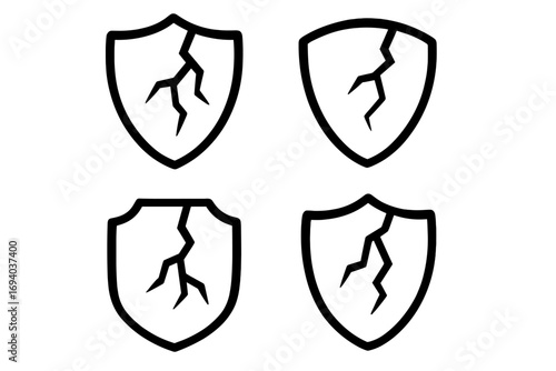 Cracked shield icon set. Metaphor for vulnerability, weak defense and failed security. Broken protection symbol. Data breach or risk concept. Unsafe, insecure vector logo.