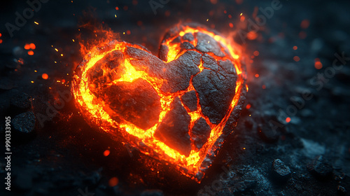 cracked stone heart with glowing inner fire symbolizes resilience, inner strength, and emotional turmoil. The break reflects vulnerability, while the flame within signifies passion and hope