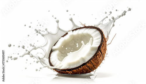 Cracked-Open Coconut with White Milk Splashing Out in Artistic Close-Up