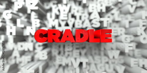 CRADLE - Red text on typography background - 3D rendered royalty free stock image. This image can be used for an online website banner ad or a print postcard.