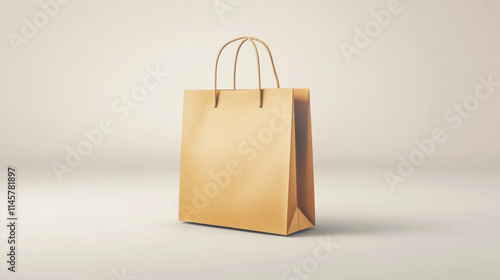 Craft brown paper bag and handle vector mockup. Shopping package mock up to carry food front view icon merchandising design collection. 3d retail reusable branding merchandise illustration