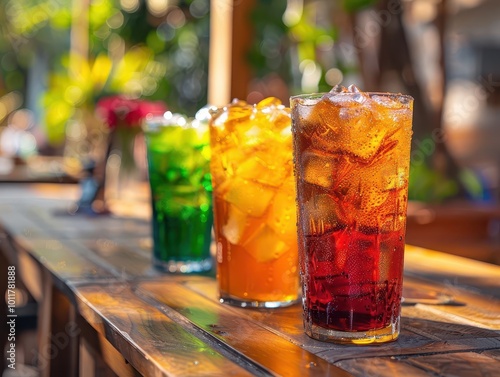 Craft soda bars with diverse flavors, artistic and refreshing, Culinary, Bright hues, Photograph, Artisanal drinks