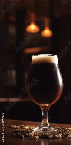 Craft wheat dark beer on the table in the pub. Vertical banner with copy space