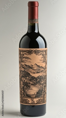 Crafted elegance of a vintage wine bottle showcasing intricate landscape art design in soft lighting