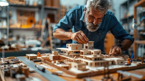 Crafting a detailed architectural model in a workshop filled with tools and materials during the afternoon. Generative AI