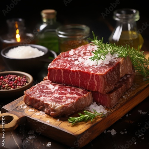 Crafting wagyu dry-aged prime cuts at a professional butcher shop exploring salt-crusted surfaces and dramatic shadow play in a rustic setting