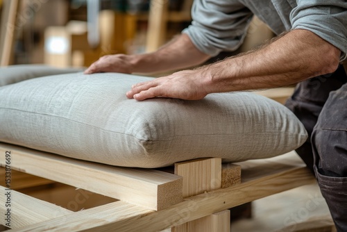 Craftsman Adjusting Soft Cushion on Wooden Chair Frame in Workshop
